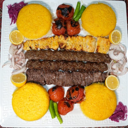 یک سیخ کباب کوبیده ۲۰۰ گرمی – یک سیخ جوجه کباب ۲۰۰ گرمی – یک سیخ کباب برگ ۲۵۰ گرمی – یک سیخ جوجه ران ۲۰۰ گرمی – 4 پرس برنج زعفرانی