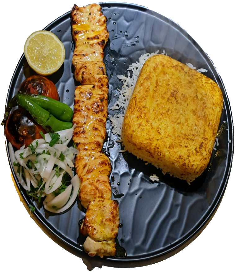 | محتویات | جوجه کباب 250 گرمی (سینه) + برنج زعفرانی |
